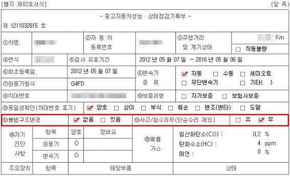 성능점검기록부에서 불법구조변경, 사고/침수유무를 반드시 확인해주세요!!
