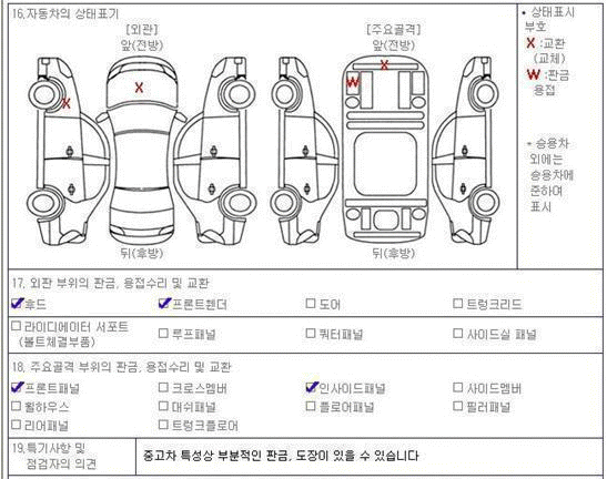 차량의 특정위치에 X가 있다는 건 교환(교체)를 의미하며, W 역시 판금이 있다는 표시이므로 성능점검기록부에 X와 W가 있다면 사고차량을 뜻합니다.