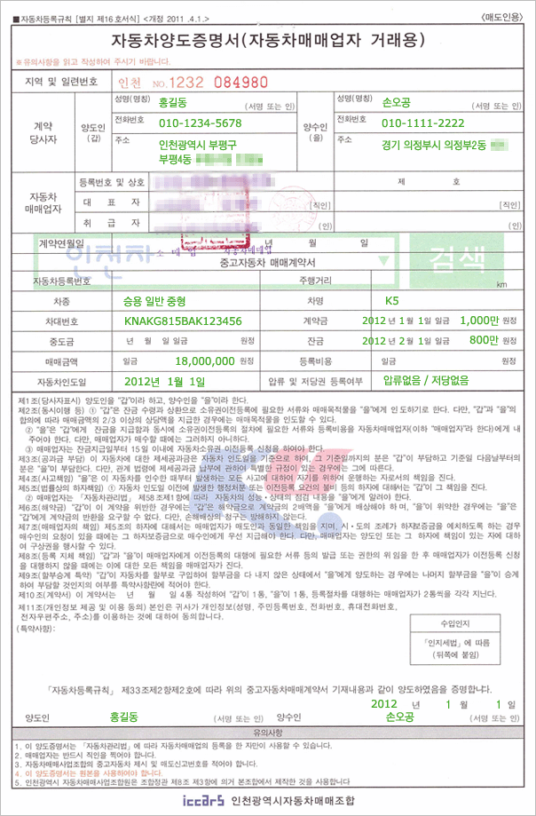 관인계약서 효력 : 자동차매매업자 등록번호, 상호, 대표자 직인 필수