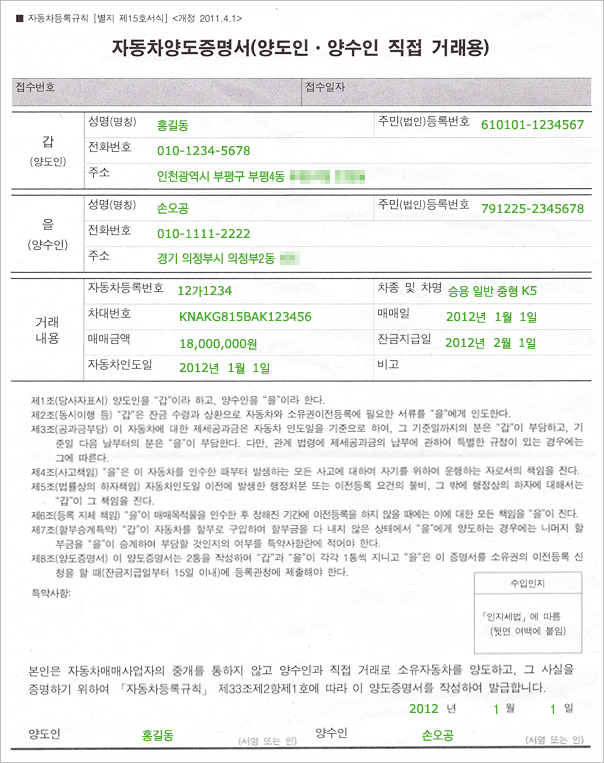 개인 직거래 : 자동차양도증명서(양도인.양수인 직접거래용)