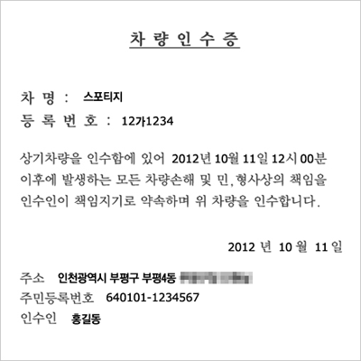 인수증에는 차량명, 차대번호, 차량번호, 인수일자, 인수시간을 꼭 기입하고, 차량 판매자 인적사항을 같이 기입하고 사인이나 도장을 첨부합니다.